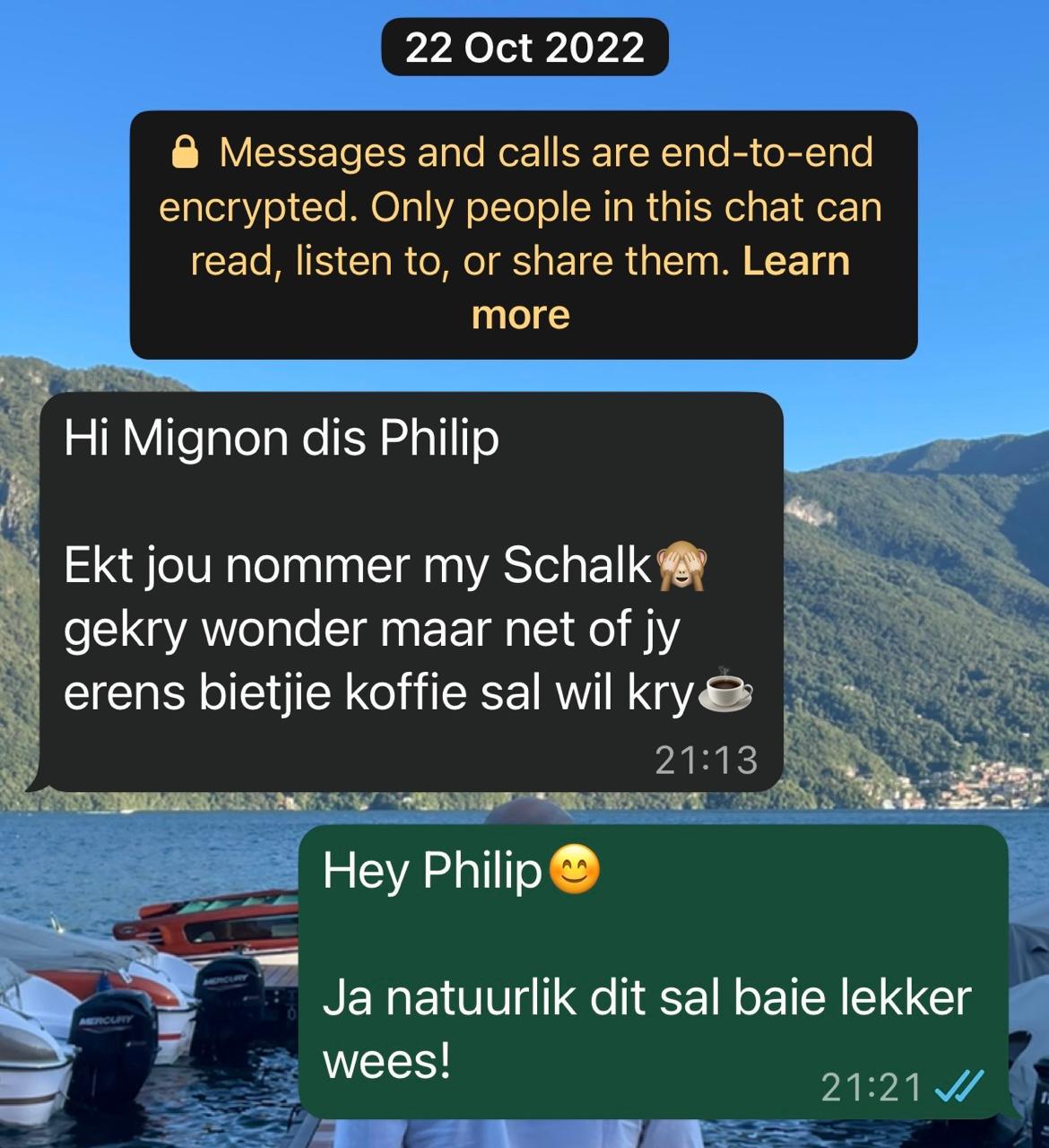 Na die mark bly ons gedagtes by mekaar en drie dae later kry Mignon die boodskap: ’n uitnodiging vir koffie.
